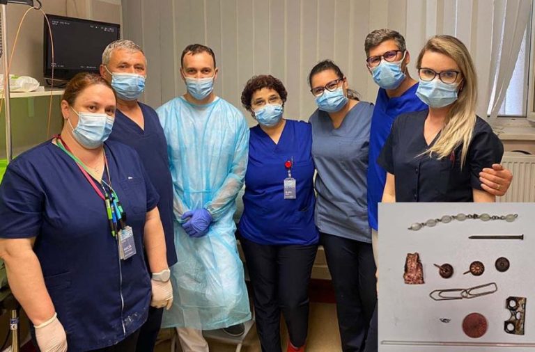 Nu este primul caz de acest fel, dar este primul caz in care s-au extras atat de multe obiecte ( 3 pionieze, un cui, 2 agrafe, o parte dintr-o balama de usa, o bratara de mana, o moneda, o bucatica de metal, partea unui termometru de camera care continea mercur – din fericire intacta ) Interventia a durat aproximativ 3 ore cu analgo-sedare efectuata de o echipa din UPU ( dr. Teodorovici Dan, asistent Delia Hancer ).