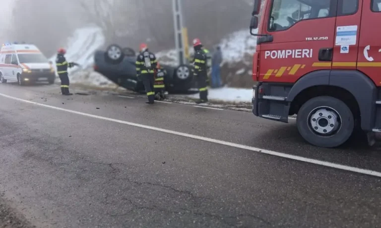 Momente de panică pe DJ 155F, unde un autoturism în care se aflau o femeie și o minoră a ieșit de pe drum și s-a răsturnat pe plafon.