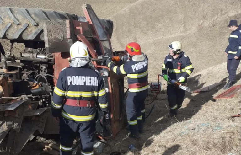 Luni după amiază, pompierii au fost înștiințați despre producerea unui eveniment în urma căruia o persoană a rămas prinsă sub un tractor care s-a răsturnat în comuna Grumăzești.
