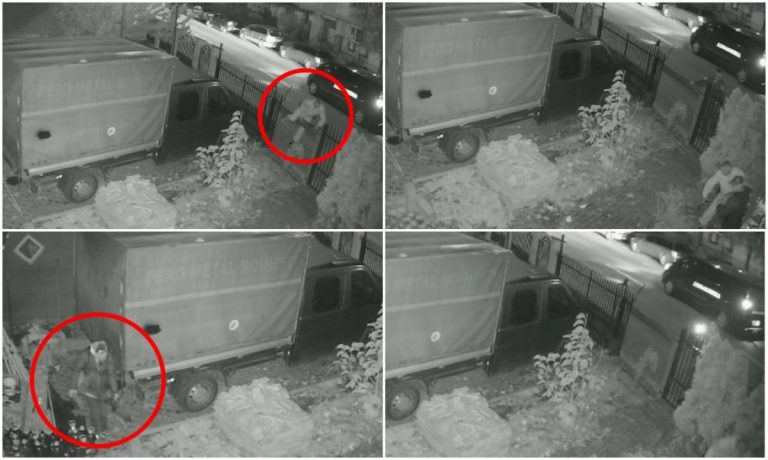 Grăzăvia demnă de scenariul unui film a avut loc luni dimineaţă, puţin înainte de ora 02:00. Pe imaginile surprinse de o cameră de supraveghere se observă cum bărbatul intră în curte, merge drept la camioneta parcată şi sustrage câteva scule din interiorul acesteia.