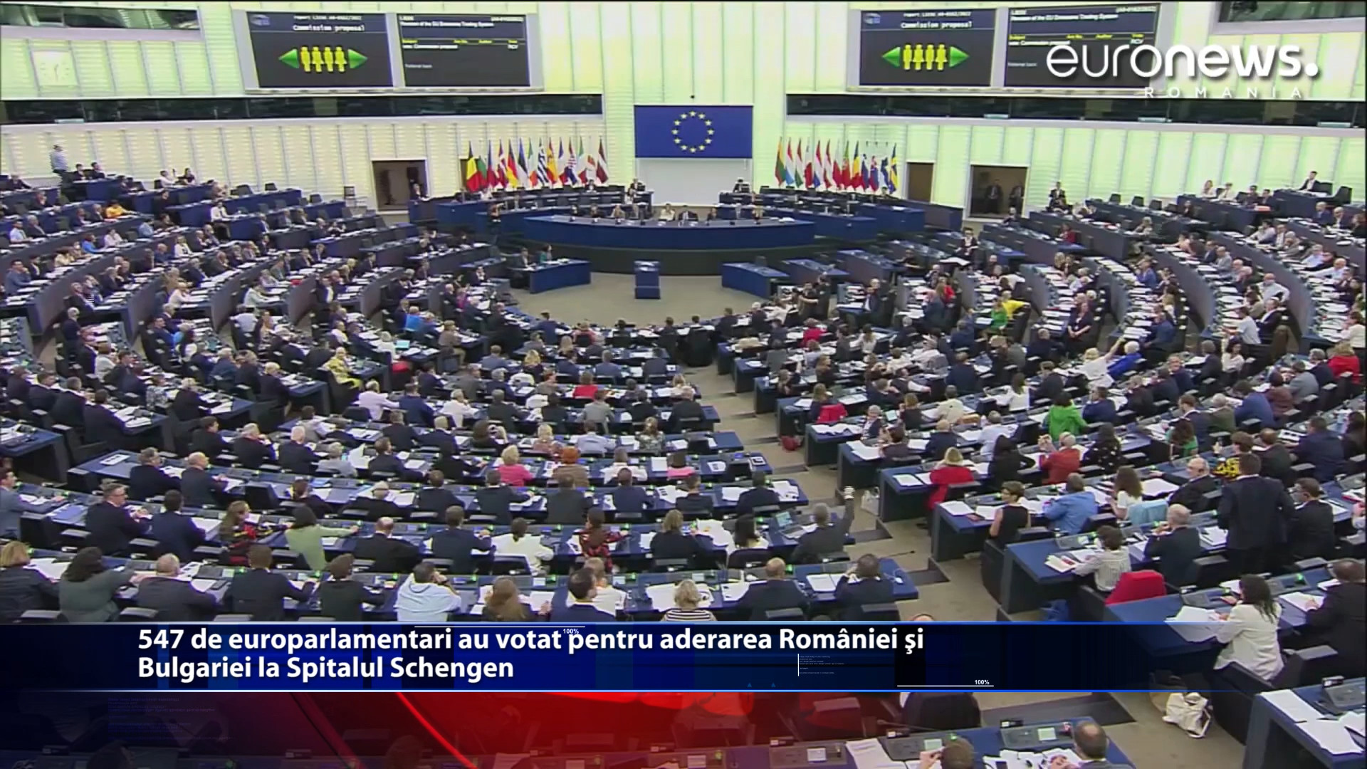 Marti, 18 octombrie, plenul Parlamentului European s-a reunit la Strasbourg pentru a vota rezolutia pentru aderarea Romaniei si Bulgariei la Spatiul Schengen. Din totalul de 639 de europarlamentari, 547 au votat pentru, 49 au fost impotriva, iar 43 s-au abtinut. Consiliul de Justitie si Afaceri Interne este programat de 8 decembrie, atunci cand se va decide daca cele doua tari vor adera la Spatiul Schengen. https://youtu.be/Nj-r7re6_Ag