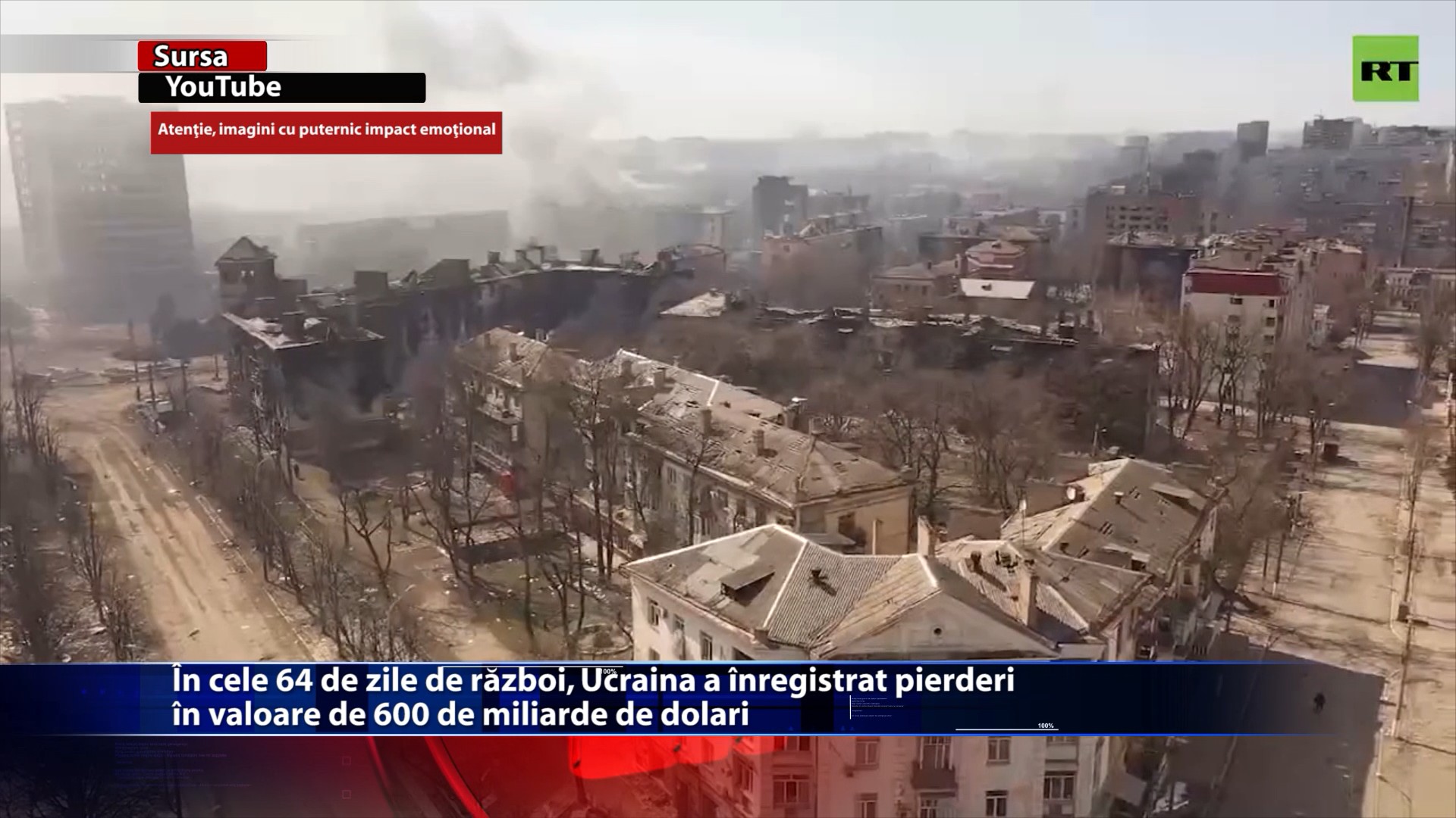 In cea de-a 64-a zi de razboi, presedintele Ucrainei, Volodimir Zelenski sustine ca razboiul a costat pana acum 600 de miliarde de dolari.Au fost distrusi peste 32 de milioane de metri patrati de spatii de locuit, 1.500 de unitati de invatamant, 350 de unitati medicale, 2.500 de kilometri de drumuri si aproape 300 de poduri. Va avertizam, urmeaza imagini si informatii care va pot afecta emotional! https://youtu.be/q74cHReZqNs