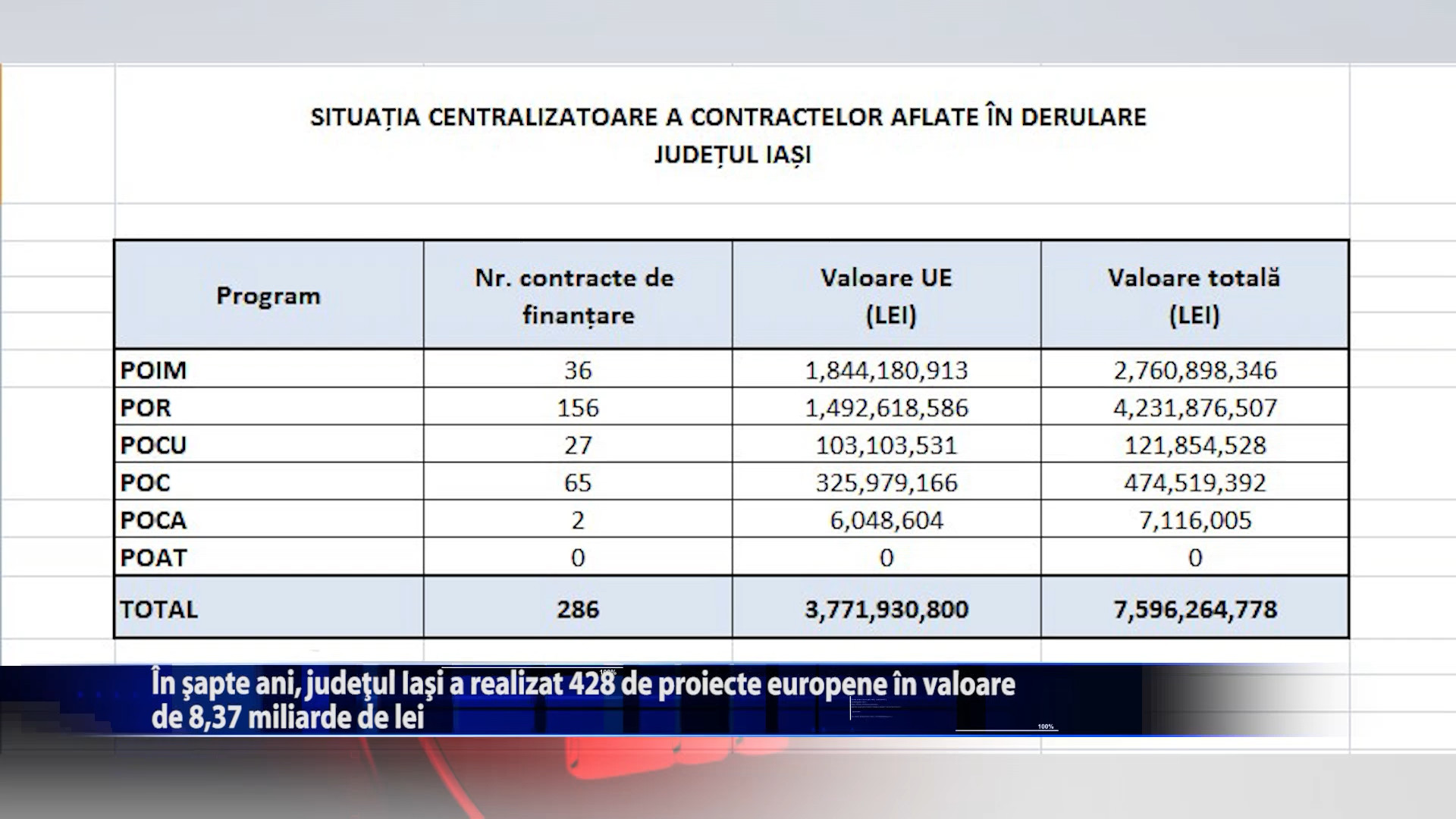 Iasul este pe locul doi in tara in ceea ce priveste valoarea proiectelor europene accesate si pe locul patru la numarul de contracte semnate. Conform statisticii realizate de Ministerul Investitiilor si Proiectelor Europene, in judetul Iasi au fost semnate 428 de contracte cu finantare europeana, in valoare de 8,37 miliarde de lei, cu 1,5 miliarde mai mult decat Cluj. In topul celor 5 judete pe primul loc este Ilfov, cu 501 proiecte europene. https://youtu.be/eUWMK8sIH-4