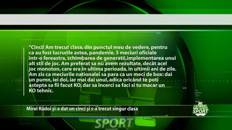 Si-a dat un cinc si s-a trecut singur clasa. Intrebat ce nota si-ar da pentru evolutia nationalei din mandatul sau, fostul selectioner a fost modest si si-a oferit nota de trecere, facand insa cateva precizari cu privire la greutatile pe care le-a intampinat pe parcursul sederii sale la timona primei reprezentative. https://youtu.be/rUsOria8S3g