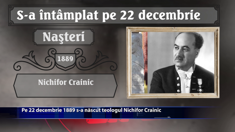 Pe 22 decembrie 1889 s-a nascut teologul Nichifor Crainic. Tot pe 2 decebrie, dar in anul 1989 dupa o saptamana de demonstratii populare si reprimari sangeroase, Nicolae Ceausescu este inlaturat de la conducerea Romaniei. Ce alte evenimente deosebite au marcat ziua de 22 decembrie, aflam din rubrica … S-A INTAMPLAT PE … https://youtu.be/m76-tH1NGlc