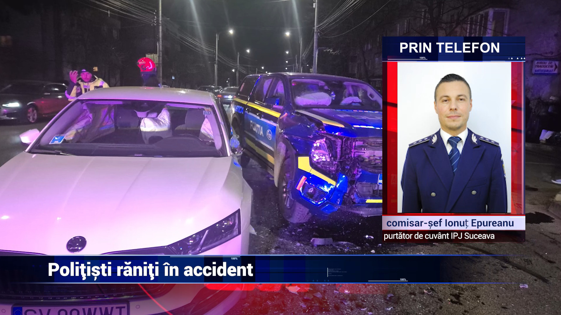 Maşina de poliţie imoplicata în accident. S-a întâmplat la Suceava, unde o autospecială de la Serviciul Criminalistic ce se îndrepta spre o misiune a fost lovită de un autoturism al cărei şofer nu a fost atent. Cei doi poliţişti din maşina au fost răniţi uşor. Atenţie, urmează imagini şi detalii cu impact emoţional.