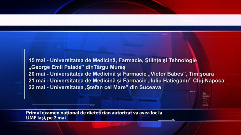 Universitatea de Medicina si Farmacie Grigore T. Popa din Iasi, in colaborare cu Colegiul Dieteticienilor din Romania, organizeaza primul examen national de dietetician autorizat, sambata, 7 mai, la ora 12.00, in Amfiteatrul Mihai Duca.Examenul se va organiza si in celelalte patru centre universitare cu program de studiu de licenta Nutritie si Dietetica din Cluj, Targu Mures, Timisoara si Suceava. Fiind organizat la nivel national, candidatii vor putea sa isi aleaga centrul universitar in care doresc sa sustina examenul. https://youtu.be/gjG1EF2WCzI