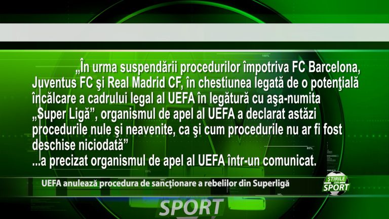 S-a terminat pericolul. UEFA a anulat actiunile disciplinare împotriva cluburilor disidente din Super League, Real Madrid, Barcelona si Juventus, dupa ce un tribunal din Madrid a decis ca organismul de conducere al fotbalului european nu ar trebui sa sanctioneze cluburile rebele. Ce se va intampla cu acestea, aflati in minutele urmatoare. https://youtu.be/VScWnKhheaw