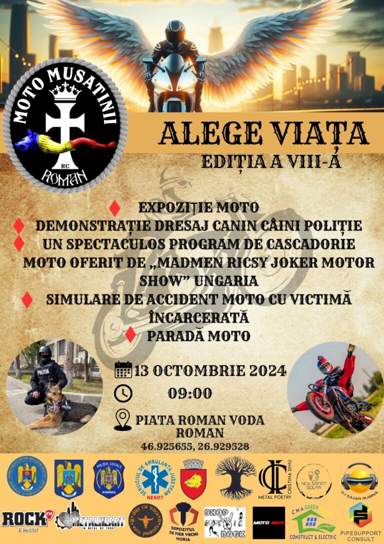 Vă reamintim că duminică, 13 octombrie 2024, începând cu ora 9:00, membrii Clubului MOTO Mușatinii RC Roman organizează cea de-a 8-a ediție a evenimentului „Alege Viața”, care va avea loc de această dată, în piața Roman Vodă din Roman.