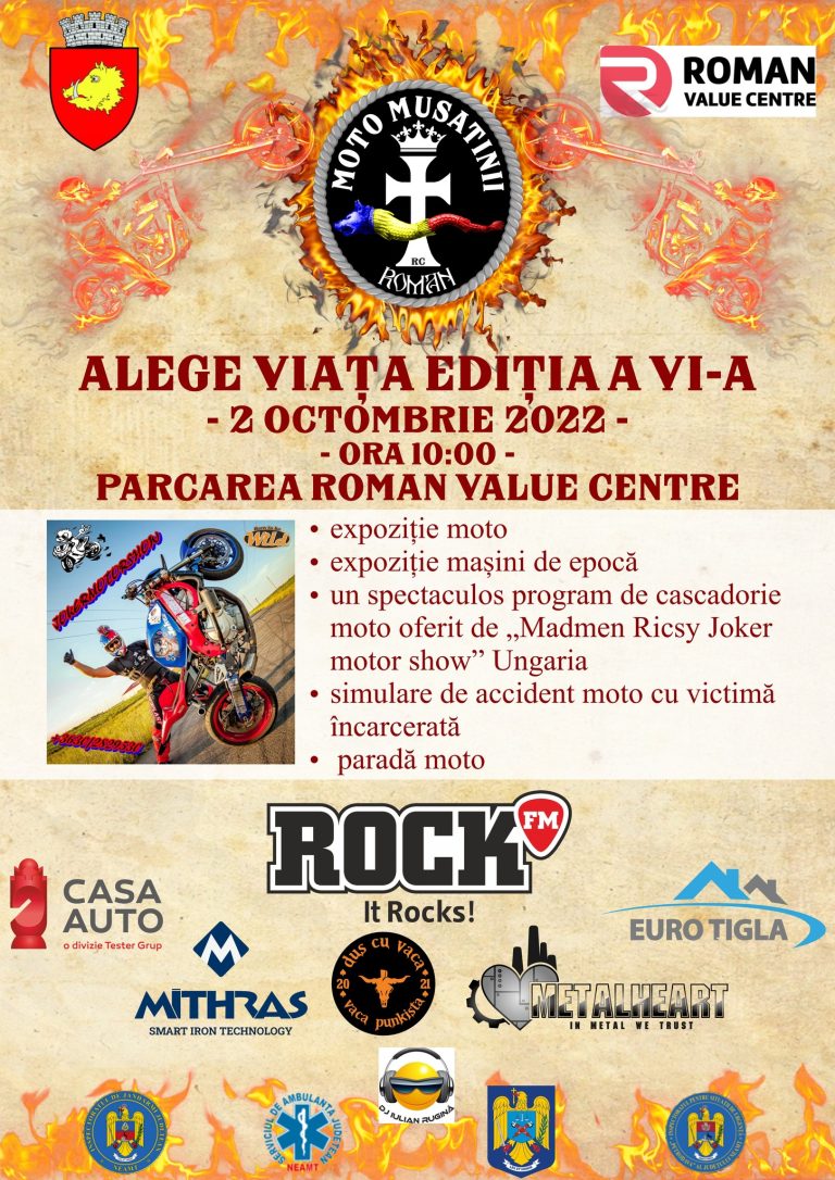 Clubul Moto Mușatinii RC Roman în colaborare cu Roman Value Centre organizează duminică, 2 octombrie evenimentul Alege Viața- ediția a VI- a. Manifestările incluse se vor desfășura în parcarea Roman Value Centre începând cu orele 10, după cum urmează: