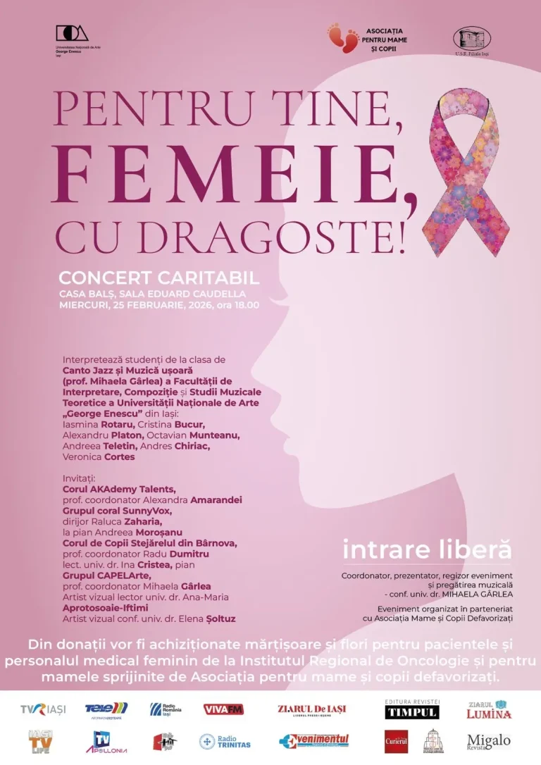 Miercuri, 25 februarie 2026, începând cu ora 18.00, la Casa Balș, în Sala Eduard Caudella va avea loc un concert caritabil dedicat femeilor diagnosticate cu cancer de la Institutul Regional de Oncologie din Iași, dar și femeilor care sunt sprijinite în cadrul Asociația pentru Mame și Copii Defavorizați.