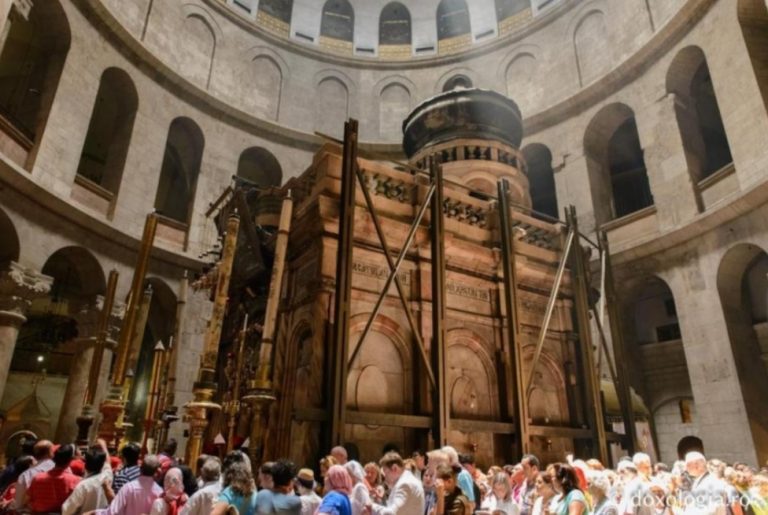 Înainte de a intra în Sfântul Mormânt, Părintele Patriarh Teofil, alături de un sobor de ierarhi, preoți și credincioși din toată lumea, îl înconjoară de trei ori, conform tradiției.