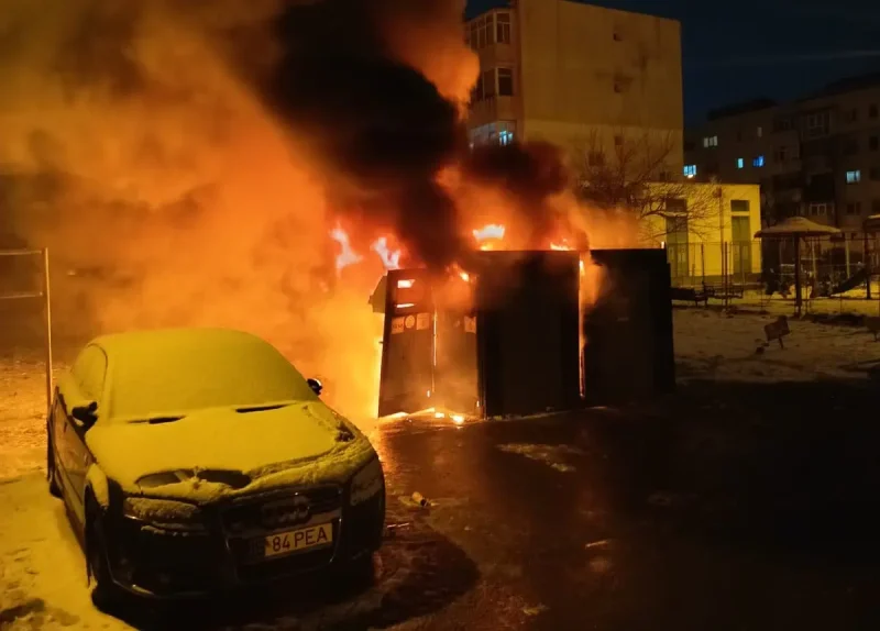 Incendiul, care a mistuit complet șase pubele, a pus în pericol bunurile aflate în vecinătate, inclusiv vehiculele rezidenților.