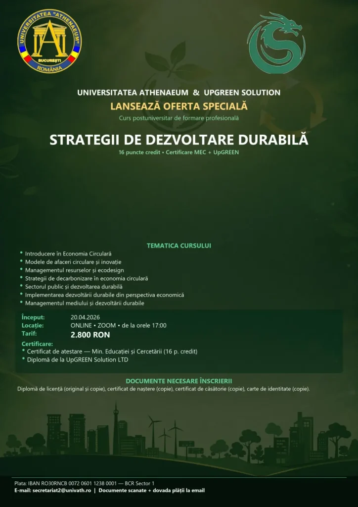 Cauți o specializare de viitor? Universitatea Athenaeum lansează o OFERTĂ SPECIALĂ pentru cursul postuniversitar „Strategii de Dezvoltare Durabilă”.