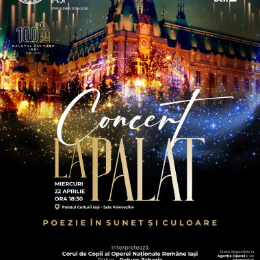 Opera Națională Română din Iași programează miercuri un nou eveniment din seria Concert la Palat. De la ora 18:30, în Sala Voievozilor a clădirii emblematice a orașului va avea loc reprezentația intitulată „Poezie în sunet și culoare”. Spectacolul va fi susținut de Corul de Copii al Operei Iași (dirijor – Raluca Zaharia), acompaniat de maestrul corepetitor Mădălina Pancu.
