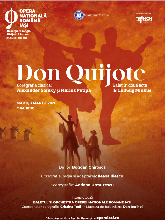 Opera Națională Română din Iași programează mâine primul spectacol al lunii martie. De la ora 18:30, în Sala Mare, iubitorii baletului sunt așteptați la o nouă întâlnire cu spectacolul „Don Quijote”, de Ludwig Minkus. Reprezentația, a cărei coregrafie, regie și adaptare sunt semnate de Ileana Iliescu, este bazată pe episoade preluate din celebrul roman „Don Quijote de La Mancha”, de Miguel de Cervantes.