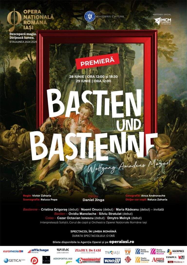 În afară de premiera „Bastien și Bastienne”, de Wolfgang Amadeus Mozart, Opera Iași mai are în program în această lună în Sala Mare încă o reprezentație, pe 29 iunie, de la ora 18.30, când închiderea stagiunii 2024-2025 va fi punctată cu spectacolul „Coruri celebre”.