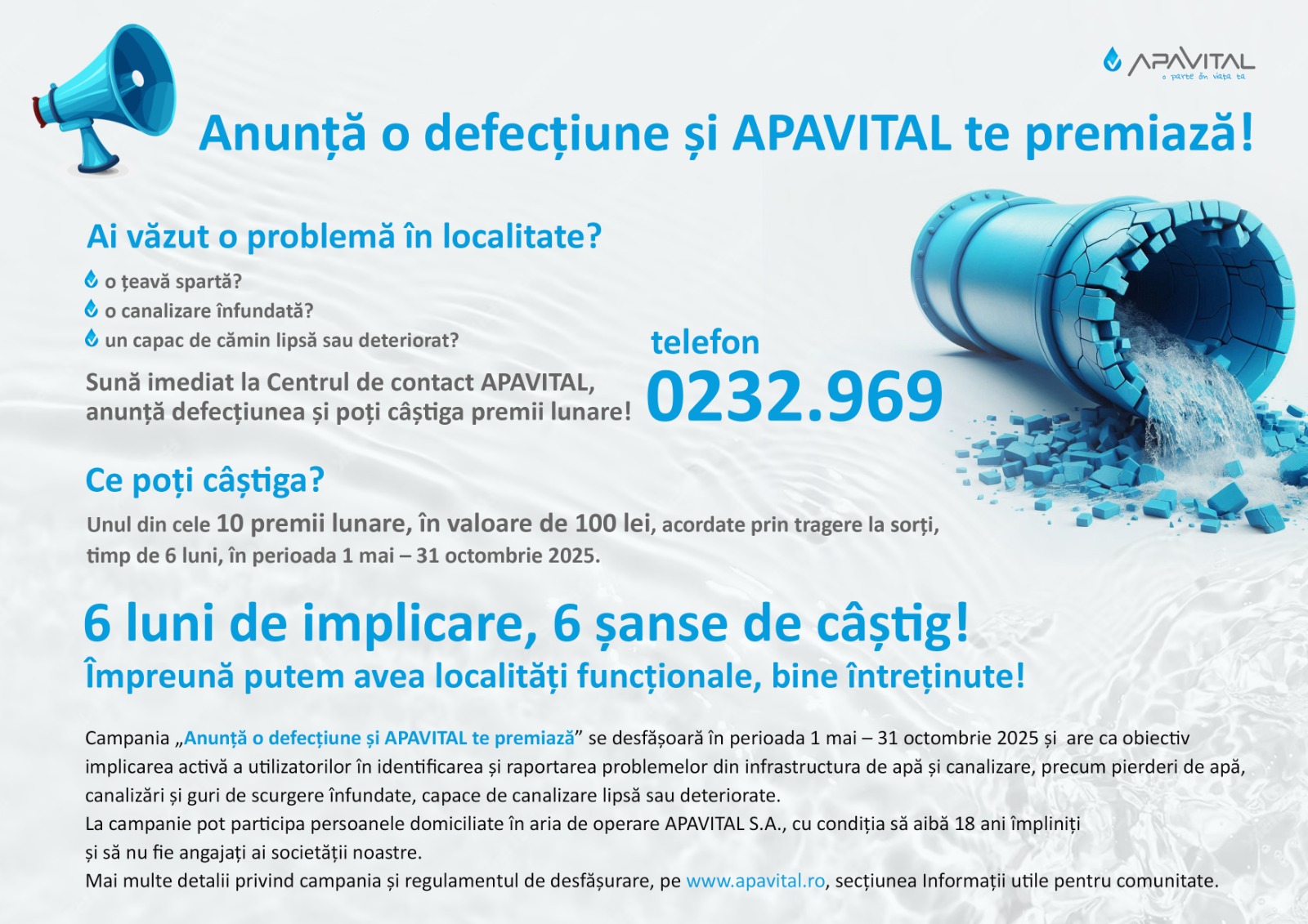 Campania ”Anunță o defecțiune și ApaVital te premiază!” își propune implicarea activă a utilizatorilor în identificarea și raportarea problemelor din infrastructura de apă și canalizare, precum pierderi de apă, canalizări și guri de scurgere înfundate sau capace de canalizare lipsă/deteriorate, pentru a menține rețeaua de apă și de canalizare în stare bună de funcționare.
