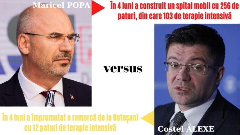 În patru luni, administrația PSD a construit un spital mobil cu 256 de paturi, din care 103 pentru terapie intensivă, în vreme ce, în patru luni, administrația PNL a împrumutat de la Botoșani o remorcă cu 12 paturi de ATI.