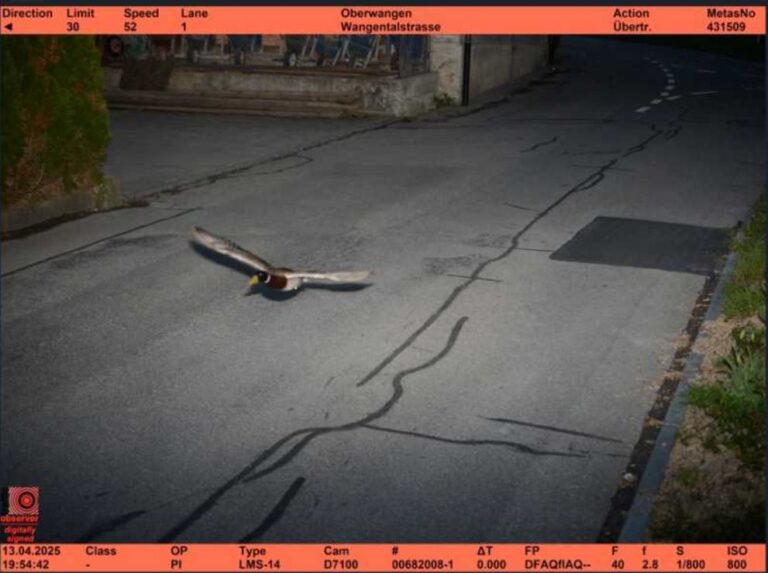 Polițiștii din orașul Konzig, situat în apropiere de Berna, au rămas stupefiați atunci când au descoperit, vizionând imaginile radar înregistrate pe 13 aprilie, că un exemplar din specia sălbatică Anas platyrhynchos, cunoscută și sub numele de ”rață mare”, s-a numărat printre autorii de contravenții reperați de sistemul de control al vitezei, a anunțat Primăria locală pe pagina sa de Facebook în weekendul trecut.