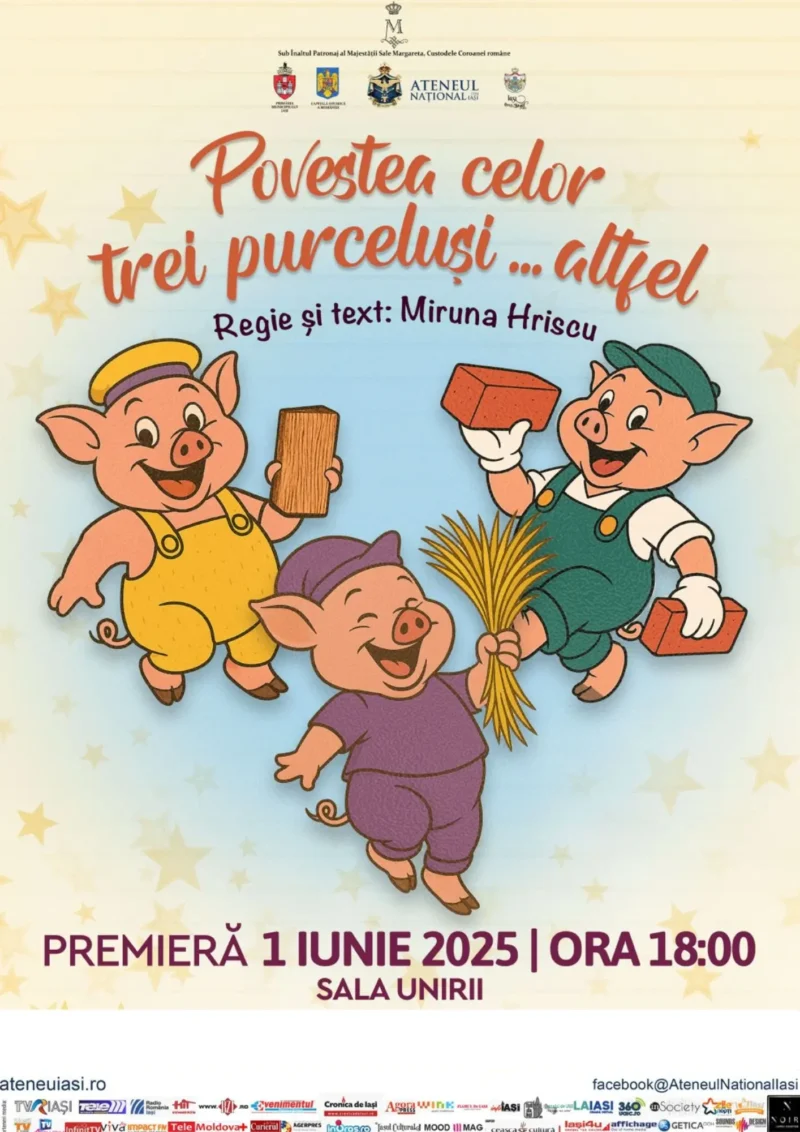Duminică, 1 Iunie, ora 18.00 cei mici sunt așteptați la o nouă PREMIERĂ pentru copii – „Cei trei purceluși…altfel”, regia Miruna Hriscu, la Sala Unirii – Cinema Victoria!