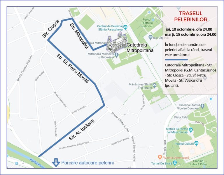 Pelerinii veniți la Iași la hramul Sfintei Cuvioase Parascheva vor fi direcționați pe următorul traseu, în funcție de numărul acestora: Splai Bahlui Mal Stâng (unde vor fi parcate și autocarele) – str. Alexandru Ipsilanti Vodă – str. Sf. Petru Movilă – str. Cloșca – str. Mitropoliei (str. arh. G. M. Cantacuzino – Catedrala Mitropolitană.