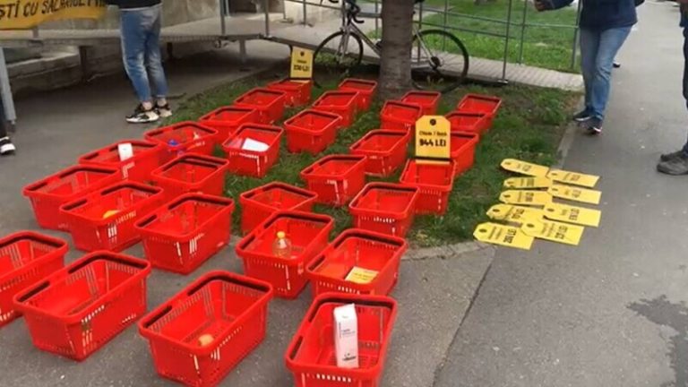Participantele la demonstraţie au adus în faţa ministerului 30 de coşuri de cumpărături, în care au pus foarte puţine produse, pentru a demonstra că salariul minim permite angajatului să îşi acopere în fiecare zi a lunii foarte puţin din necesarul pentru un trai decent. Astfel, potrivit calculului Declic, salariul minim pentru anul viitor permite alocarea a doar 119 lei pe lună pentru igienă şi a numai 230 de lei pentru plata utilităţilor.
